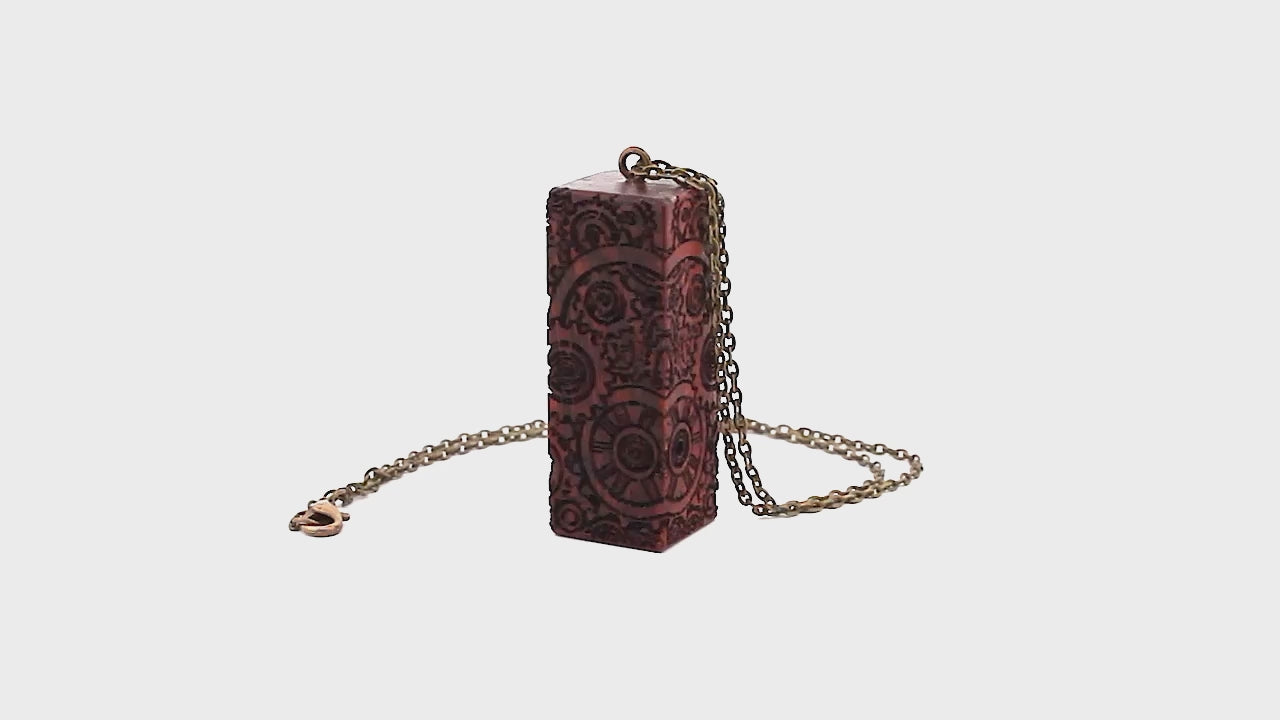 This 4-sided wooden pendant features a design around gears. A unique addition to any outfit, this pendant is sure to catch some attention. Measurements: 3/4"x 3/4" x 2"