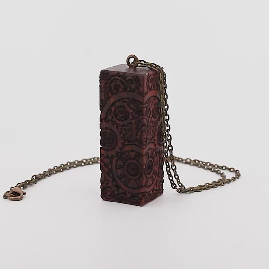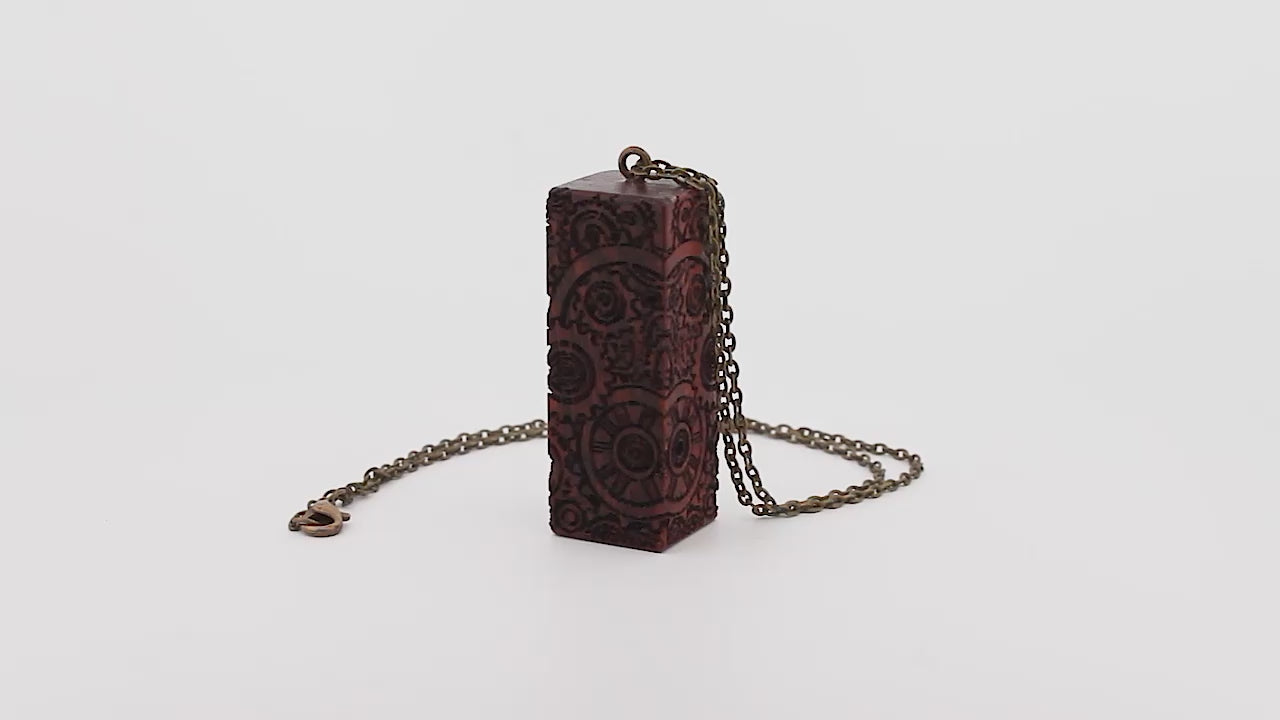 Crafted from wood, this unique pendant features skulls on all four sides. Perfect for adding a touch of edge to any outfit. Available in adjustable chain or rope. Measurements: 3/4"x 3/4" x 2"